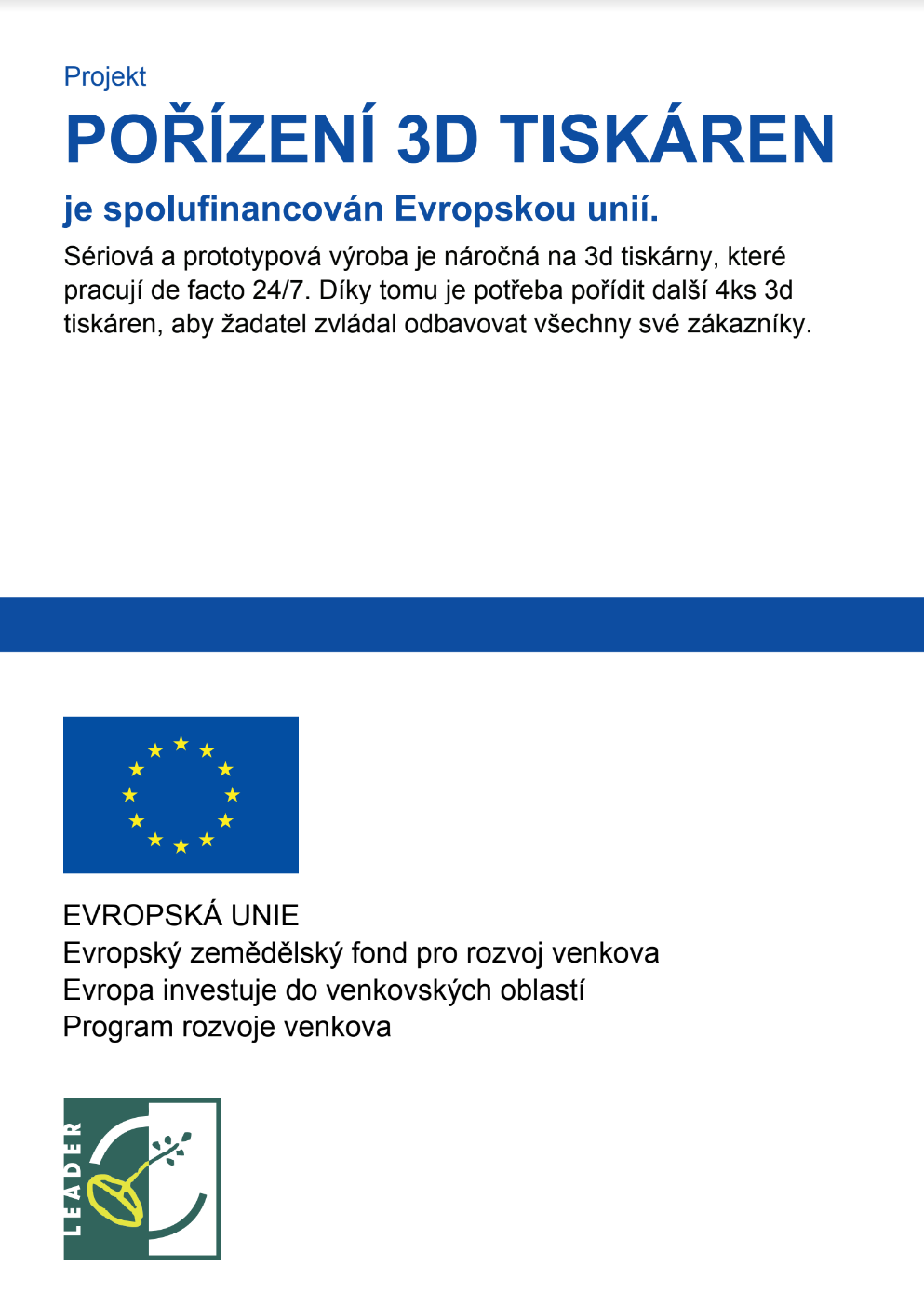 S podporou EU, jmenovitě Programu rozvoje venkova ČR na období 2014 – 2020, jsme pořídili 4 ks 3d tiskáren.